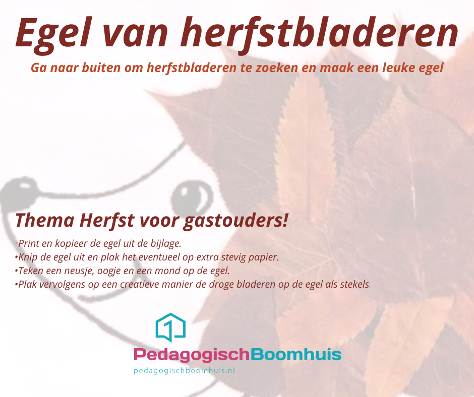 Stimuleer tijdens de activiteit verschillende ontwikkelingsgebieden. Eerst ga je samen met de kinderen in gesprek over de egel. Hiermee stimuleer je de mondelinge taalontwikkeling . Daarna mogen de kinderen aan de slag. Met hun fijne motoriek plakken ze de bladeren vast. Dit doen ze op hun eigen manier ( beeldende expressie ). Met kleine en grote bladeren beplakken ze de egel. Hierbij stimuleer je de cognitieve ontwikkeling . Waar past elk blaadje? Waar is nog wat ruimte over?
